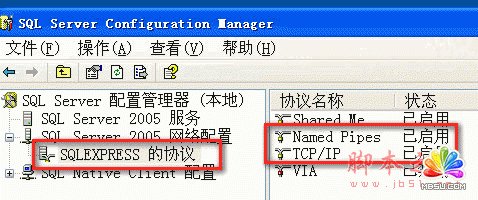 5、開啟SQL Server 2005的網(wǎng)絡協(xié)議TCP/IP和管道命名協(xié)議并重啟網(wǎng)絡服務。