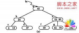[例如],在 圖4.2(c)的B-樹中刪去關(guān)鍵字37之后,雙親b結(jié)點(diǎn)中剩余信息(“指針c”)應(yīng)和其雙親*a結(jié)點(diǎn)中關(guān)鍵字45一起合并至右兄弟結(jié)點(diǎn)*e中,刪除后的B-樹如圖 4.2(d)所示。