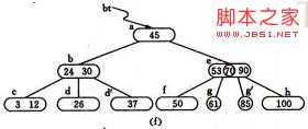 反之,若在B-樹上刪除一個(gè)關(guān)鍵字,則首先應(yīng)找到該關(guān)鍵字所在結(jié)點(diǎn),并從中刪除之,若該結(jié)點(diǎn)為最下層的非終端結(jié)點(diǎn),且其中的關(guān)鍵字?jǐn)?shù)目不少于ceil(m/2),則刪除完成,否則要進(jìn)行“合并”結(jié)點(diǎn)的操作。假若所刪關(guān)鍵字為非終端結(jié)點(diǎn)中的Ki,則可以指針Ai所指子樹中的最小關(guān)鍵字Y替代Ki,然后在相應(yīng)的結(jié)點(diǎn)中刪去Y。例如,在下圖 圖4.1( a)的B-樹上刪去45,可以*f結(jié)點(diǎn)中的50替代45,然后在*f結(jié)點(diǎn)中刪去50。