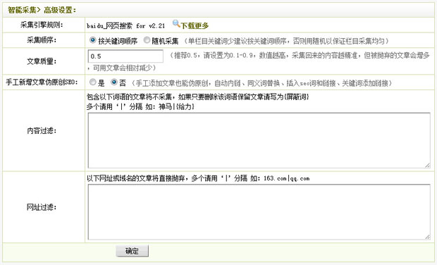 自動(dòng)標(biāo)題、段落重排、高級(jí)混淆、自動(dòng)內(nèi)鏈、內(nèi)容過(guò)濾、網(wǎng)址過(guò)濾、同義詞替換、插入seo詞語(yǔ)、關(guān)鍵詞添加鏈接等多種方法手段對(duì)采集回來(lái)的文章加工處理,增強(qiáng)采集文章原創(chuàng)性,利于搜索引擎優(yōu)化,提高搜索引擎收錄、網(wǎng)站權(quán)重及關(guān)鍵詞排名。