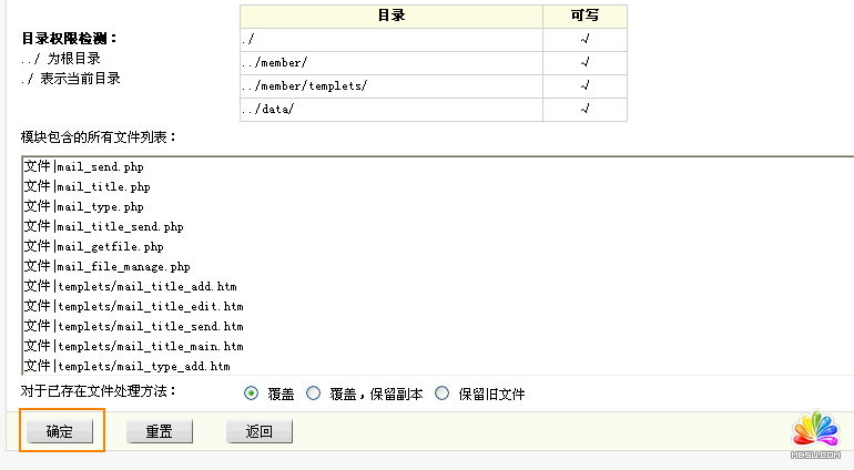 出現(xiàn)模塊安裝界面,對(duì)于已存在文件處理方法默認(rèn)為覆蓋舊程序。選擇“確定”按鈕(如圖2)。