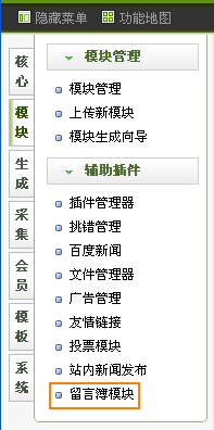 1、 進(jìn)入后臺-模塊-輔助插件(圖5),單擊“留言薄模塊”,彈出留言薄模塊前臺界面(圖6)。這里,我們也可以直接在地址欄輸入http://www.yourname.com/plus/guest.book打開留言薄前臺界面。