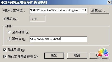然后點(diǎn)擊旁邊的“配置”,擦看是否有.php擴(kuò)展名,如果沒有的話,需要添加一個(gè)新項(xiàng),將可執(zhí)行文件指向“C:WINDOWSsystem32inetsrvfcgiext.dll”,擴(kuò)展名為“.php”(注意有個(gè)點(diǎn)),動(dòng)作限制為“GET,HEAD,POST,TRACE”,點(diǎn)擊確定即可(圖11)