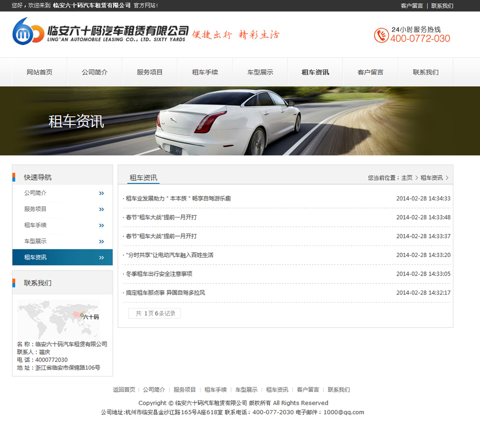 1.關(guān)于我們,服務(wù)項(xiàng)目,租車(chē)手續(xù),聯(lián)系方式 三個(gè)欄目的內(nèi)容請(qǐng)?jiān)跈谀抗芾?欄目?jī)?nèi)容處修改!