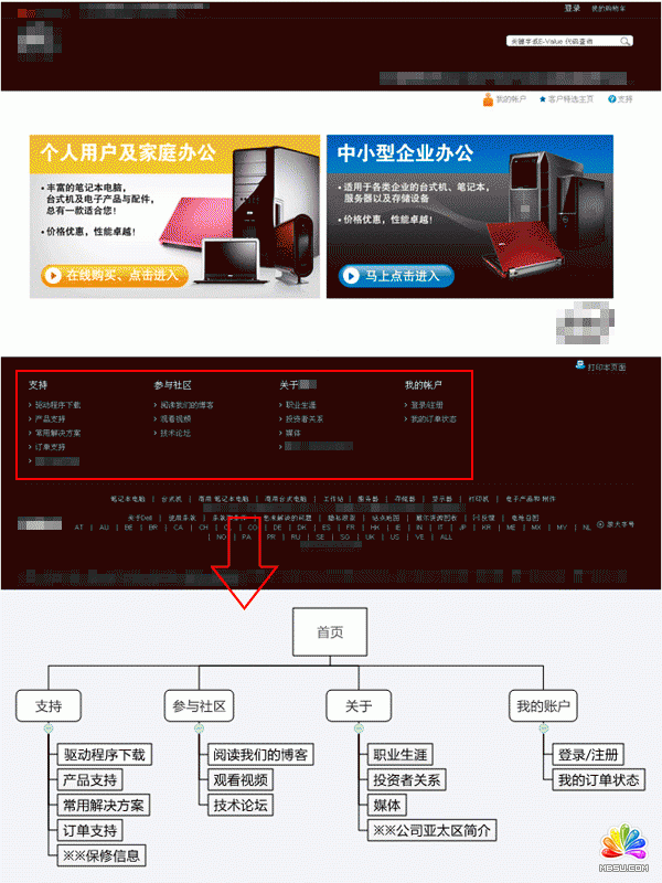 這是某電腦公司的官方網(wǎng)站,他們的導(dǎo)航本身就是一個(gè)站點(diǎn)地圖。他們將14項(xiàng)內(nèi)容分級(jí)組成了一個(gè)兩層的結(jié)構(gòu)樹(shù),每個(gè)分支上都有3-4項(xiàng)內(nèi)容。對(duì)于這樣一個(gè)信息量不是很龐雜的網(wǎng)站來(lái)說(shuō),使用主題或科目的方案,將信息組成一個(gè)兩層的結(jié)構(gòu)樹(shù),就是一種深廣度平衡的方式。
