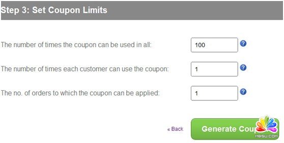 第三步:依次設置優(yōu)惠券的使用次數(shù)、每位客戶可以使用優(yōu)惠券的次數(shù)、每張優(yōu)惠券可以使用的訂單個數(shù)。設置完好后點擊“Generate Coupon”(創(chuàng)建優(yōu)惠券)。