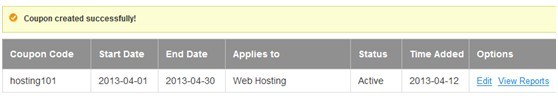 第一步:設置Coupon Code(優(yōu)惠券代碼。如hosting101,即對象為主機產(chǎn)品)、Coupon Description(優(yōu)惠券描述,如10% of on hosting,即優(yōu)惠券信息為10%折扣優(yōu)惠)、Start Date(起始時間,及結(jié)束時間)
