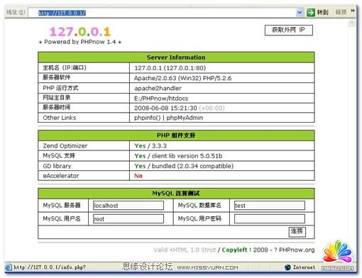 2、瀏覽器中輸入“http://127.0.0.1”后顯示配置相關(guān)信息,可以輸入MySQl密碼進(jìn)行連接測試。