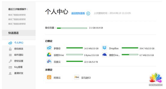 可以在右上角的個(gè)人中心里綁定想備份到的云,這是我覺(jué)得多備份最有特色的地方。另外還有密碼修改、邀請(qǐng)好友加流量等常見(jiàn)功能。