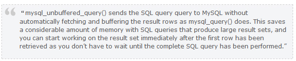 關(guān)于這個(gè)事情,在PHP的文檔中有一個(gè)非常不錯(cuò)的說(shuō)明:mysql_unbuffered_query()函數(shù):