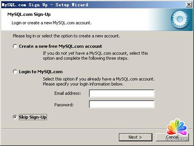這里是詢問你是否要注冊一個mysql.com的賬號,或是使用已有的賬號登陸mysql.com,一般不需要了,點選“Skip Sign-Up”,按“Next”略過此步驟。