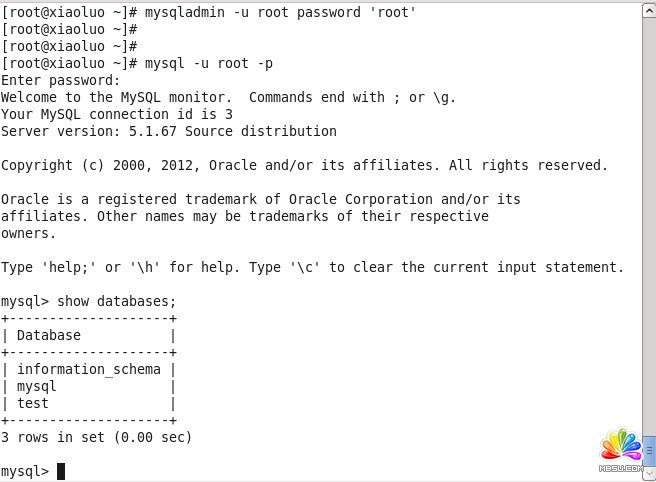 [root@xiaoluo ~]# mysqladmin -u root password 'root' // 通過(guò)該命令給root賬號(hào)設(shè)置密碼為 root