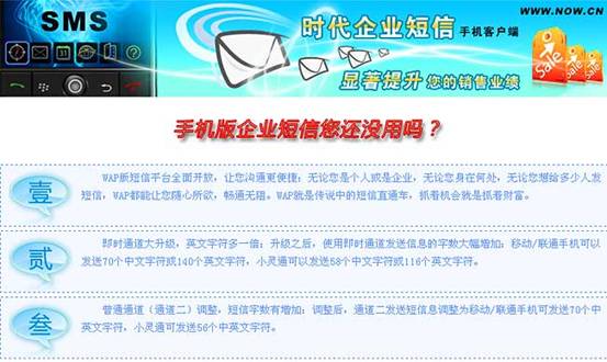 - 企業(yè)短信手機客戶端全面開放了!現在,無論你是個人還是企業(yè),無論你身在何處,無論你想給多少人發(fā)短信。只要通過WAP版短信平臺,就會讓你享受到最便利的移動辦公。這是繼沸沸揚揚的3G普及消息后,筆者在時代互聯處,了解到的又一通過手機平臺為人們帶來無限