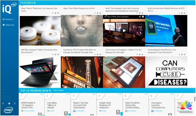 Intel的程序可以快速搜遍大量的社群網(wǎng)站,把發(fā)現(xiàn)到的內(nèi)容,傳給網(wǎng)站(iQ)的編輯員工,然后再根據(jù)新鮮度、相關(guān)性、分享次數(shù)、點(diǎn)擊次數(shù)、員工互動、以及獨(dú)特性,過濾出在社群網(wǎng)絡(luò)上最吸引注意的內(nèi)容。最后,再以色彩鮮艷、迷人、觸控優(yōu)化的接口呈現(xiàn),讓讀者可以快速有效地瀏覽內(nèi)容。