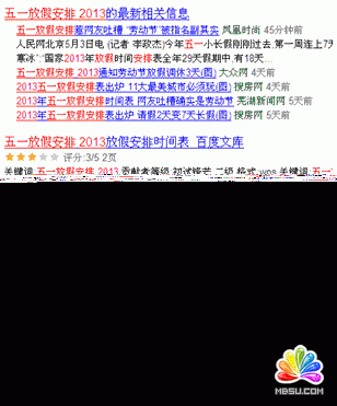 我們就從“五一放假安排2013”這個詞作為突破口,我們可以看到排名第一位的是百度網(wǎng)頁應用,這個我們就不提了,剩下的是新聞、百度文庫以及高權重的個人網(wǎng)站。對于這一塊,想百度自己的產(chǎn)品還有新聞我們站長就不要打小算盤了,更有一些站長為了節(jié)日單獨做了幾個網(wǎng)站,我覺得可以嘗試,但是耗費的經(jīng)歷也頗大.