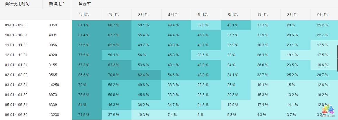 對于A產(chǎn)品,因為產(chǎn)品特殊性以及所處生命周期,留存率遠(yuǎn)遠(yuǎn)高于互聯(lián)網(wǎng)平均水平,月留存率甚至可以達(dá)到74.95%,3月留存率也達(dá)到47.79%,可以說不具備代表性。不過在運營中通過查看留存率做分析,遇到過留存率異常情況,比如針對高峰期新生入學(xué)的一批新用戶,留存率如果很低,那么很可能是用戶忘記了初始密碼,運營需要做的就是聯(lián)系對應(yīng)園所老師,配合進(jìn)行賬號查詢及密碼初始化服務(wù),否則很可能會丟失這部分客戶。
