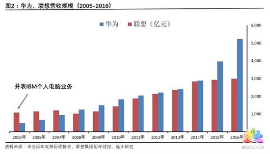在柳傳志和楊元慶的掌舵下,聯(lián)想的確越做越大。在1994年之后的很長一段時(shí)間內(nèi),華為雖然保持極高的增長速度,但在收入規(guī)模上始終沒能追上頻繁并購的聯(lián)想,一直到2008年,華為才徹底在營收上壓倒聯(lián)想,并將優(yōu)勢保持至今。