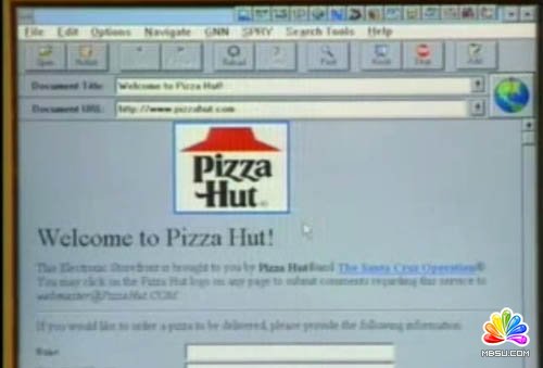 這是CompuServe的另外一項(xiàng)功能,“網(wǎng)頁(yè)瀏覽器”,名為air mosaic,這是當(dāng)時(shí)必勝客(Pizza Hut)的主頁(yè)。